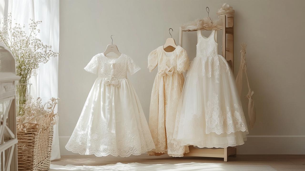 Pour les parents souhaitant une tenue plus sophistiquée, les robes ornées de dentelle offrent une alternative somptueuse. La dentelle peut être utilisée sur l'ensemble de la robe ou simplement pour agrémenter certaines zones comme les manches, le corsage ou le bas de la jupe. Le tulle constitue également un tissu apprécié pour créer du volume et une silhouette véritablement princière, à condition qu'il soit accompagné d'une doublure douce pour protéger la peau de votre bébé. Les accessoires raffinés comme les perles cousues délicatement, les strass discrets ou les applications florales peuvent enrichir la robe sans la rendre inconfortable. Certains modèles proposent des manches bouffantes qui évoquent l'esprit romantique des contes de fées, tandis que d'autres privilégient des manches courtes ou longues plus ajustées. L'arrière de la robe mérite également une attention particulière avec parfois un nœud généreux en satin ou une traîne légère qui ajoute une dimension féerique à l'ensemble.